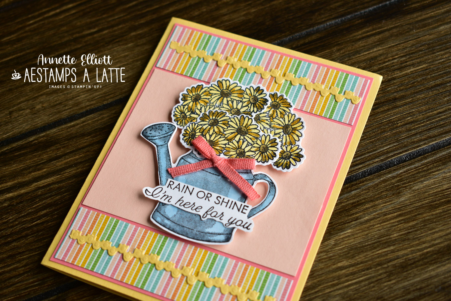 I love how you have several ways to ink/color the images in this set. You can stamp it with different color inks and it will look beautiful, or you can stamp and color it.I chose a bright and cheery striped piece of DSP from the Pattern Party 12" x 12" Hostess DSP to accent my watering canister of daisies and added a layer of Blushing Bride and Flirty Flamingo cardstock to my So Saffron card base.