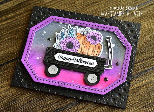 Next, I die cut a Basic Black wagon from the Filled with Fun Bundle and added colored pumpkins and sunflowers from the Rustic Crate Bundle.I then added a Gorgeous Grape die cut and Black stamped frame using the Country Corners stamp set (retired) with the Country Corner Dies.