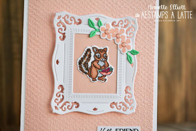 When I first received my Storybook Bundle, I colored and die cut out many of the animal images and this cute squirrel was one of them. I quickly found a home for her using up some pre-embossed (and unused) pieces which paired perfectly with my squirrel.